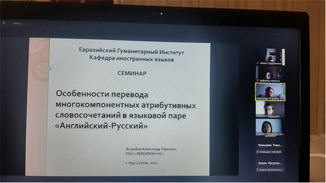 26 января 2022 года в рамках учебной практики для студентов 2 курса образовательной программы «Переводческое дело» (академическая группа ПД-20-01) был проведен вебинар «Особенности перевода многокомпонентных атрибутивных словосочетаний в языковой паре «Английский — Русский»». Спикером выступил Ястребов Александр Юрьевич, основатель переводческого агентства «Лексикон – НС». Студенты прослушали предоставленный материал, выполнили практические задания и задали вопросы, связанные с их будущей профессиональной деятельностью. Вебинар прошел продуктивно, интересно, участники получили много новой и полезной информации.