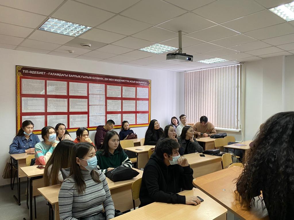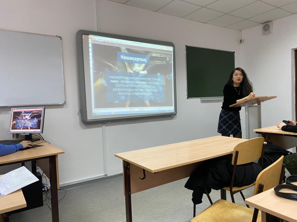 14 февраля 2022 года куратор кафедры иностранных языков Кадрина Б. Ш. организовала круглый стол на тему «Нашақорлықты алдын алу» для студентов 3 курса образовательной программы «Переводческое дело» (академическая группа АI-19-01). Студенты просмотрели видеоролик «Нашақорлыққа салынған жасөспірімдер» и приняли активное участие в обсуждении вопросов пагубного влияния на здоровье употребления наркотических веществ.