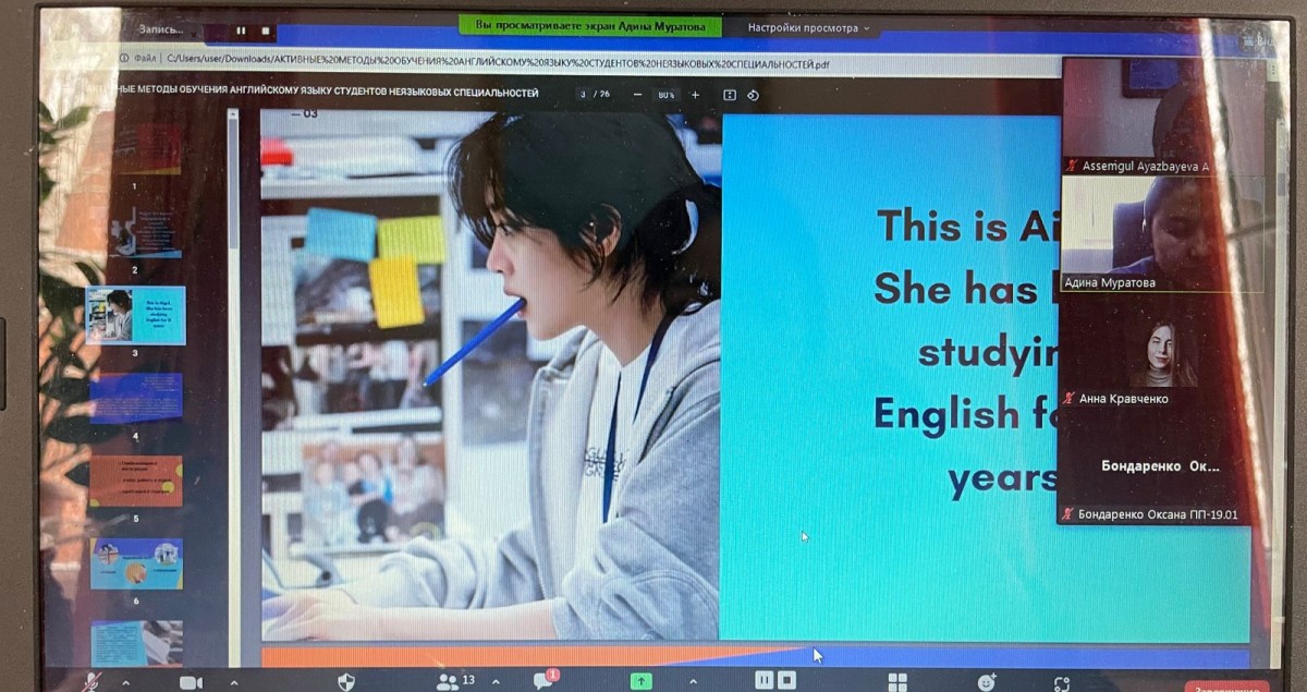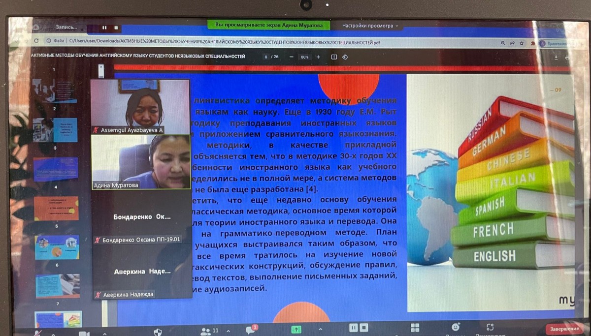 14 февраля 2022 года в рамках входящей зарубежной академической мобильности старший преподаватель УНПК «Международный университет Кыргызстана» Муратова А.А. приступила к чтению лекций по дисциплине «Активные методы обучения английскому языку студентов неязыковых специальностей» для студентов 3 курса образовательной программы 6В01102 – «Педагогика и психология» Евразийского гуманитарного института.