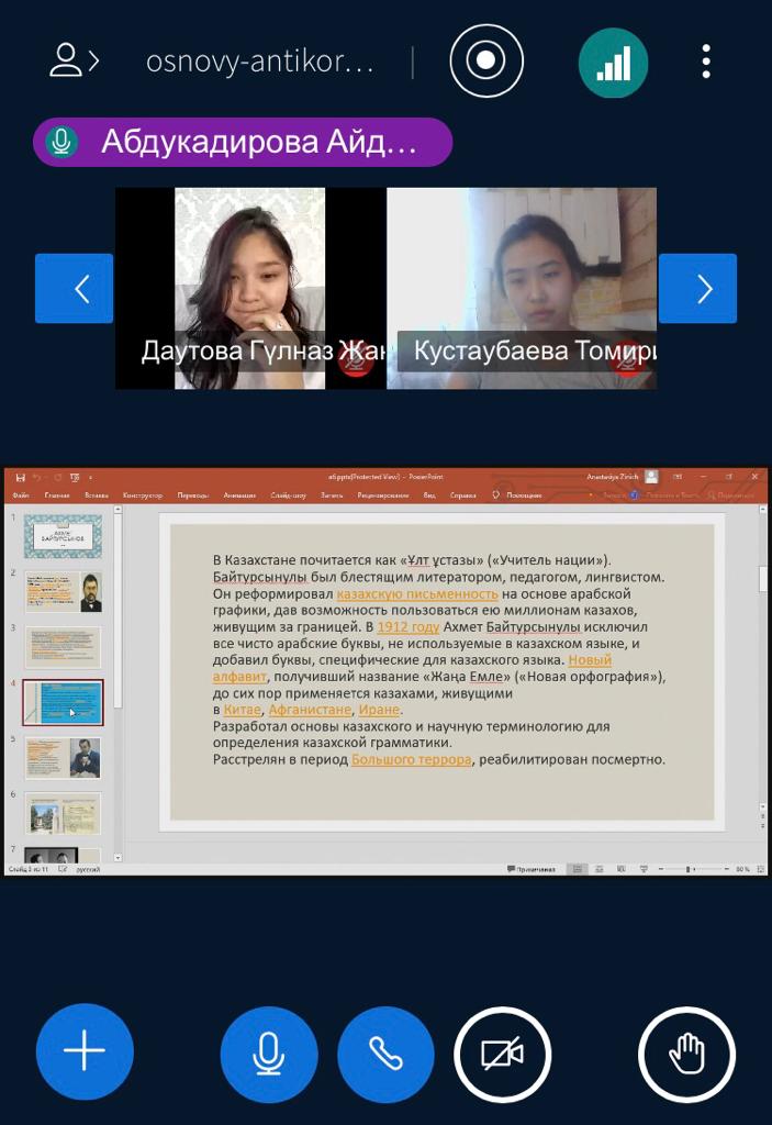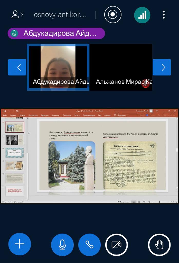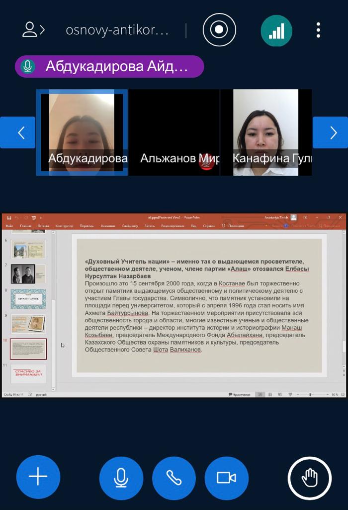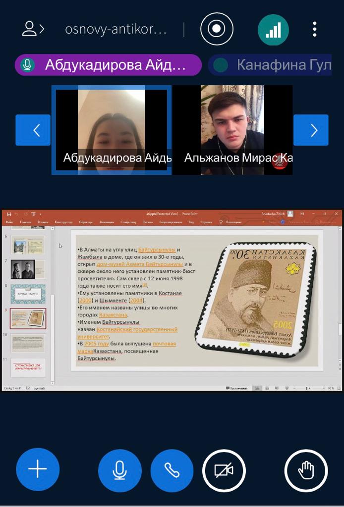 18 февраля 2022 года куратор Канафина Г.А для студентов академической группы ЮР-21-01 (образовательная программа «Юриспруденция») провела кураторский час «Ахмет Байтурсынов – сеятель человечности и знаний», посвященный 150-летию со дня рождения А.Байтурсынова. Выступая перед собравшимися, Канафина Г.А. подчеркнула, что вся жизнь Ахмета Байтурсынова была пронизана пламенной заботой о самоопределении казахов, развитии культуры, образования и науки, сохранении самобытного народного творчества и духа нации.