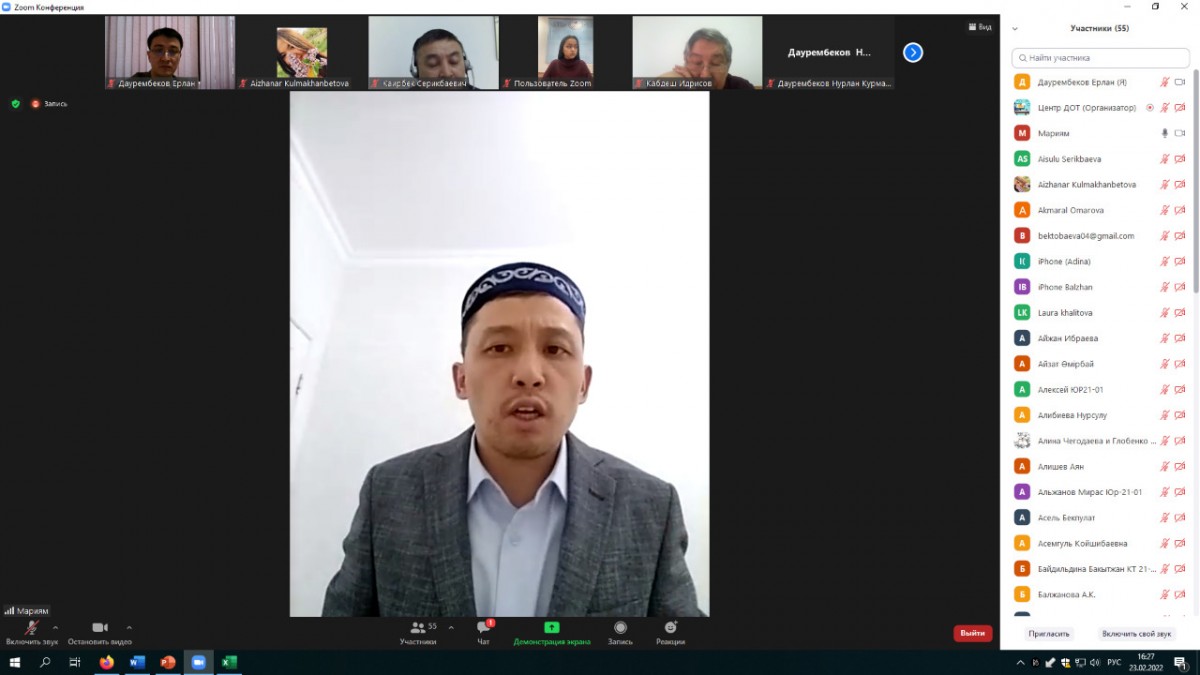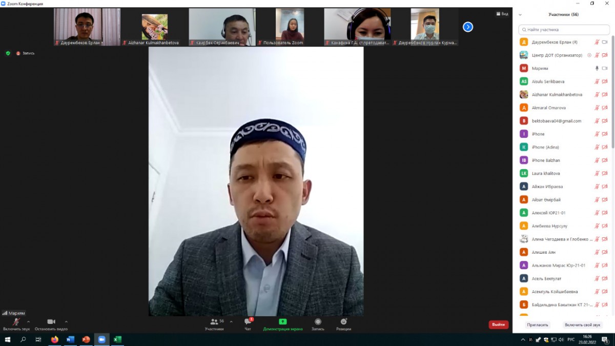 23 февраля 2022 года кафедра юридических дисциплин организовала в онлайн формате для преподавателей и студентов Евразийского гуманитарного института встречу на тему «Формирование религиозной грамотности среди обучающихся в целях профилактики религиозного экстремизма» с участием главного имама мечети Абу-Наср Аль-Фараби Рамазановым Нурланом.