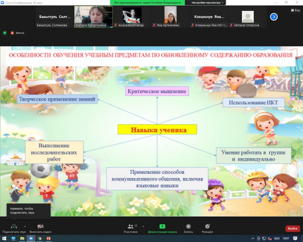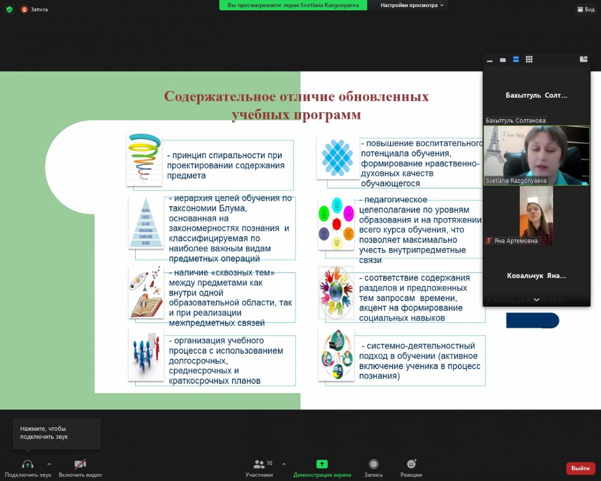 23 февраля 2022 года учителем начальных классов КГУ «Школа – гимназия № 32» Разгоняевой Светланой Владимировной проведен онлайн семинар «Активные методы и формы работы в рамках обновлённого содержания образования» для студентов образовательной программы 6В01303 – «Педагогика и методика начального обучения». Обучающиеся приняли активное участие в работе семинара, задали большое количество вопросов по обсуждаемой теме. Встреча завершилась признанием профессионализма выпускника института и наилучшими пожеланиями успехов в дальнейшем.