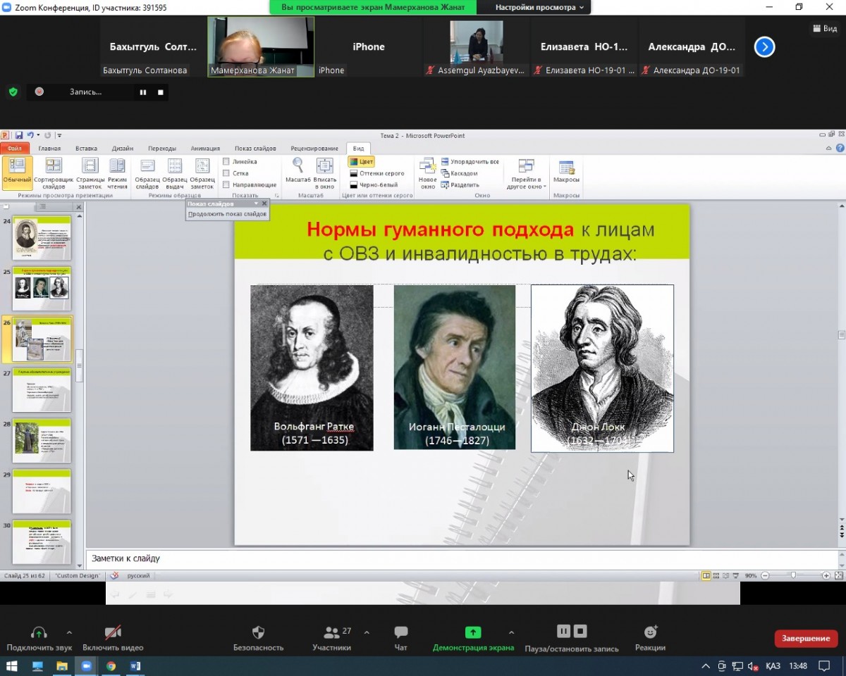Кандидат педагогических наук, доцент кафедры ППиМНО Академии «Bolashaq» (г.Караганда) Мамерханова Жанат Мухамедхановна, реализуя программу академической мобильности, прочитала  лекцию на тему: «История возникновения и развития инклюзивного образования» в рамках дисциплины «Инклюзивное образование» для студентов 3-го курса  образовательной программы  «Педагогика и методика начального обучения» и образовательной программы «Дошкольное обучение и воспитание» Евразийского гуманитарного института. Лектор раскрыла исторический аспект изменения отношения общества к лицам с особыми образовательными потребностями.