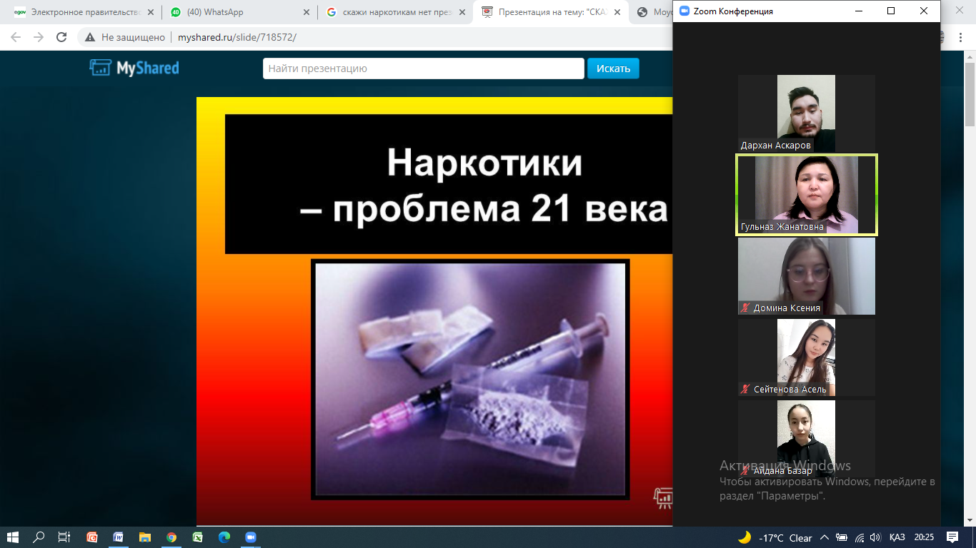 16 марта 2022 года куратор кафедры педагогики Рахимжанова Г.Ж. провела в формате ZOOM кураторский час на тему: «Наркотики – проблема ХХІ века» для студентов академической группы ПП-21-01 (образовательная программа 6В01102 – Педагогика и психология). Цель мероприятия – формирование культуры поведения, направленного на борьбу с вредными привычками, изменение негативной позиции в отношении людей, страдающих наркоманией.