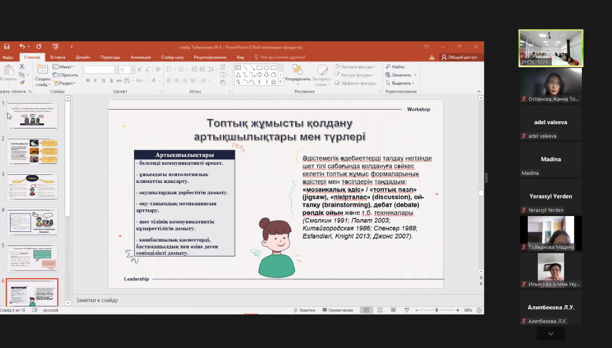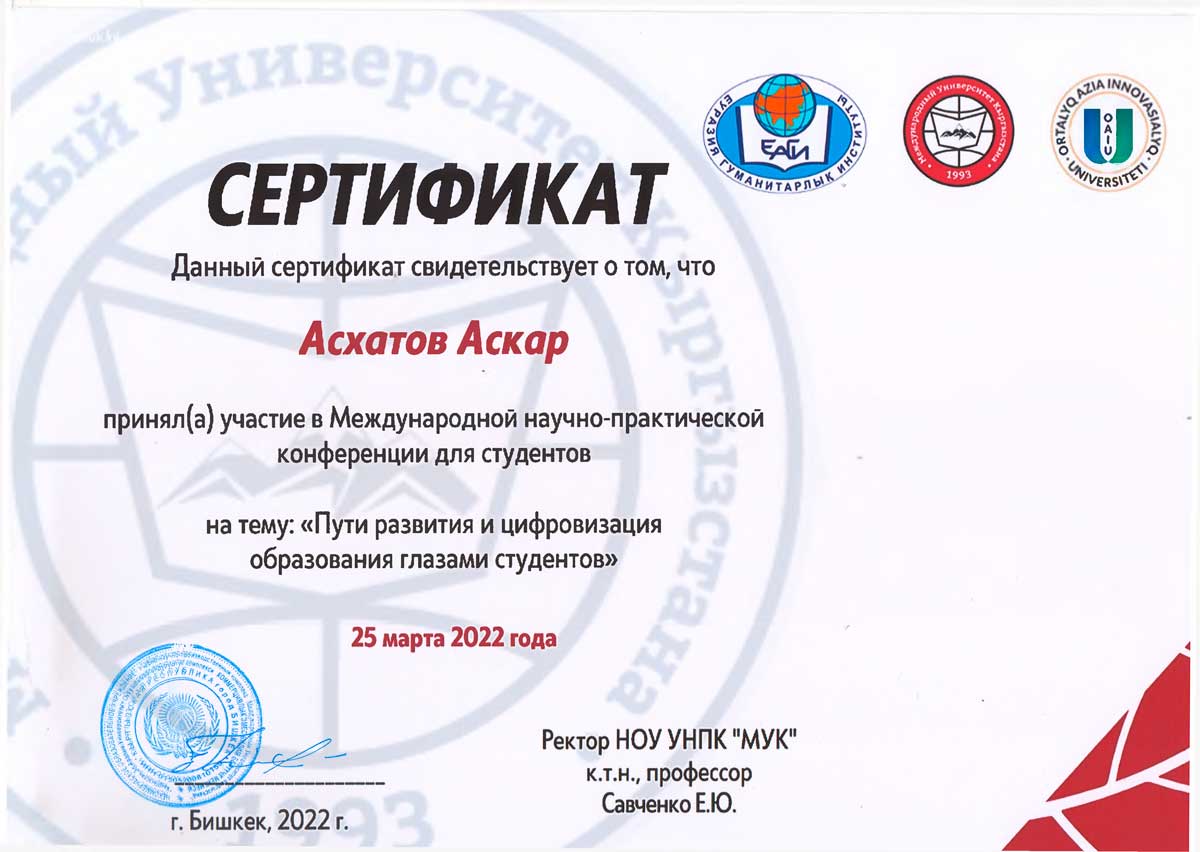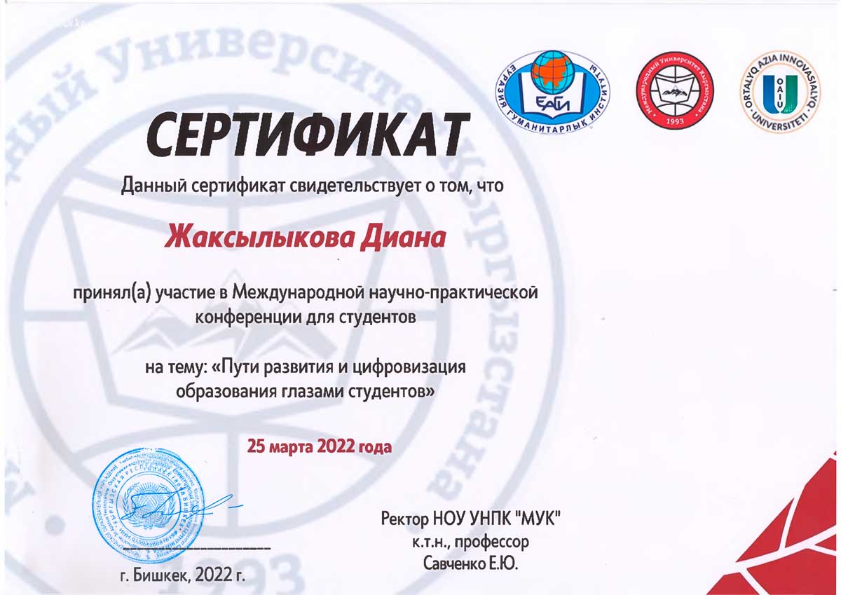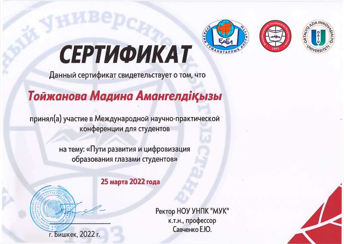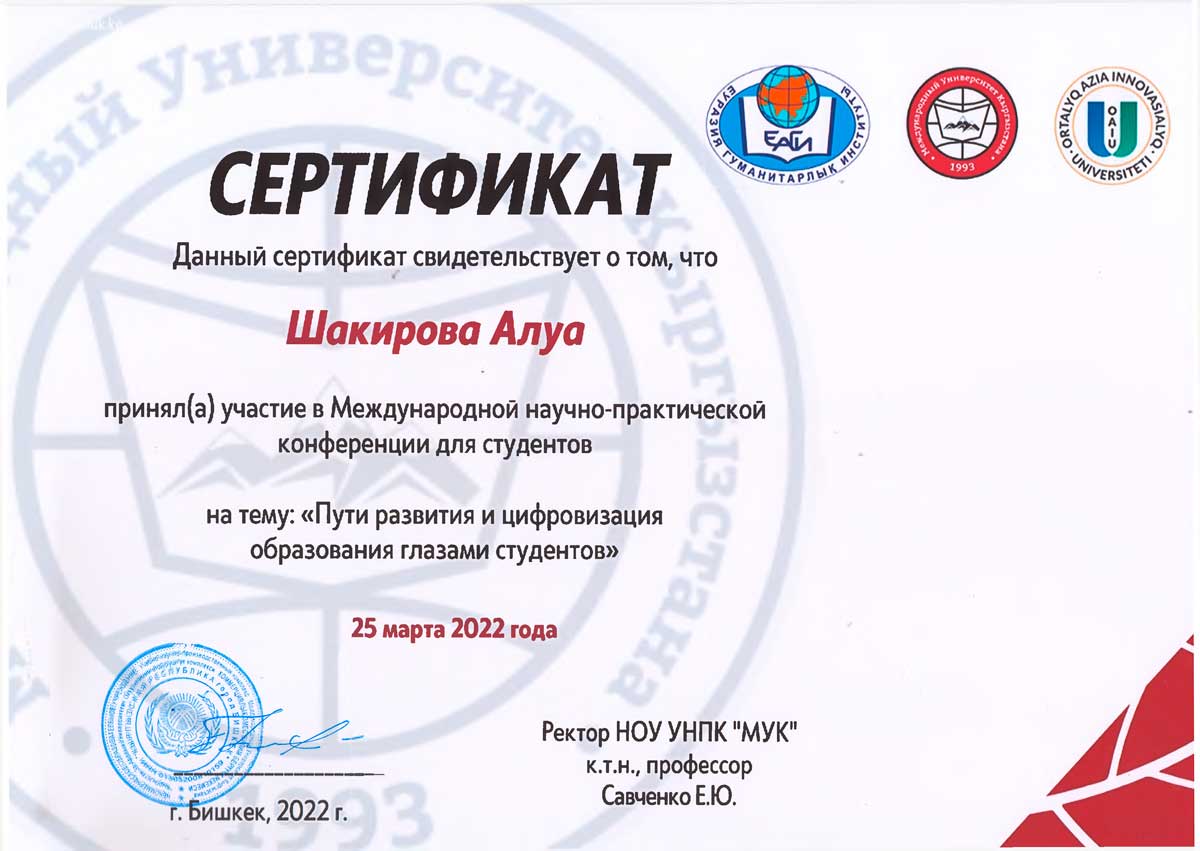Сертификатами за участие в конференции были отмечены студенты: Ембергенова Айдана (научный руководитель: м.п.н., доцент Ильясова А. У.), Валеева Адель, Сейфуллина Карина (научный руководитель: к.ф.н., доцент Нуркенова С.С.), Дамирова Жанар, Жаксылыкова Диана, Шакирова Алуа (научный руководитель: м.г.н., старший преподаватель Ильясова А.К.), Телманова Қымбат (научный руководитель: PhD, доцент Ж. Т. Оспанова); Ерден Ерасыл, Жұмағұл Еркебұлан, Тойжанова Мадина (научный руководитель: м.п.н., доцент Алипбекова Л.У.), Бернгард Алина (научный руководитель: м.п.н., старший препедаватель Альжанова А.О.).