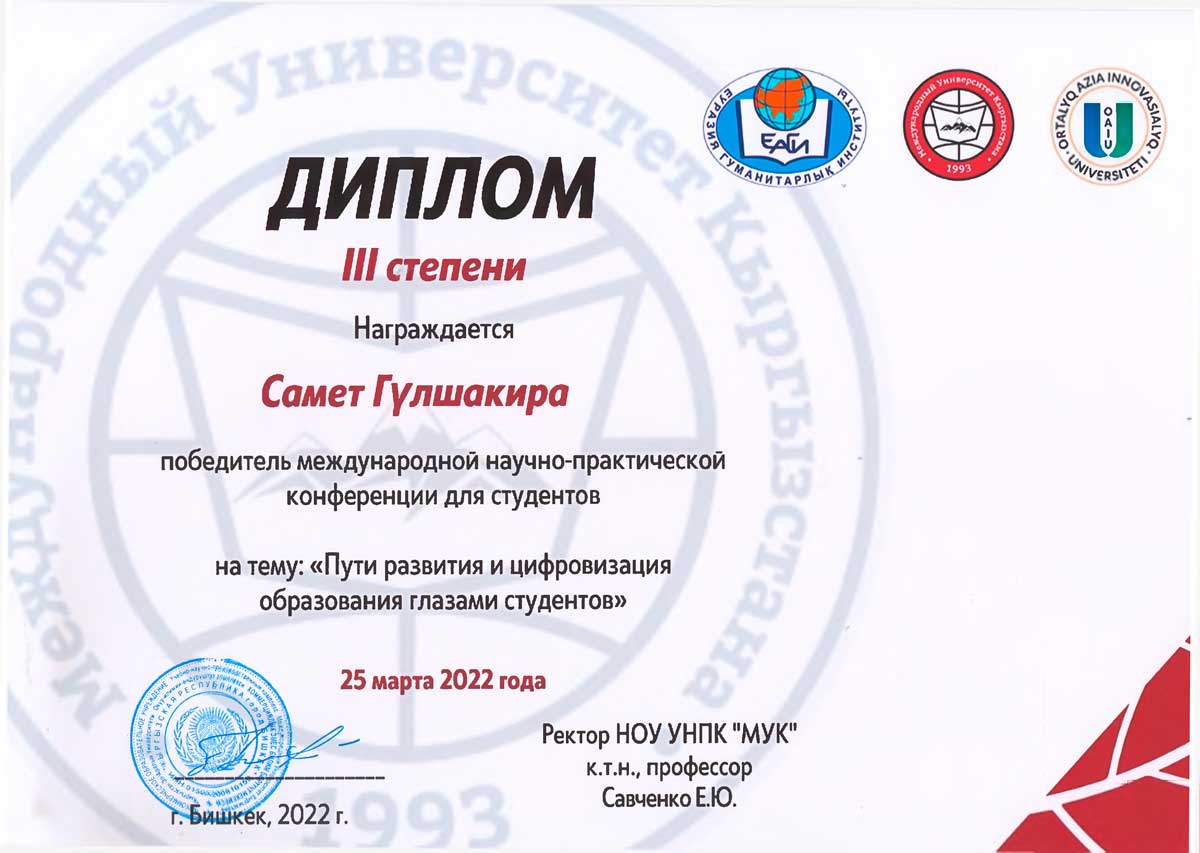 Диплом III степени награждена Самет Гүлшакире за доклад на тему: «Использование метода проектов на уроках иностранного языка» (научный руководитель: м.п.н., доцент Ильясова А. У.).