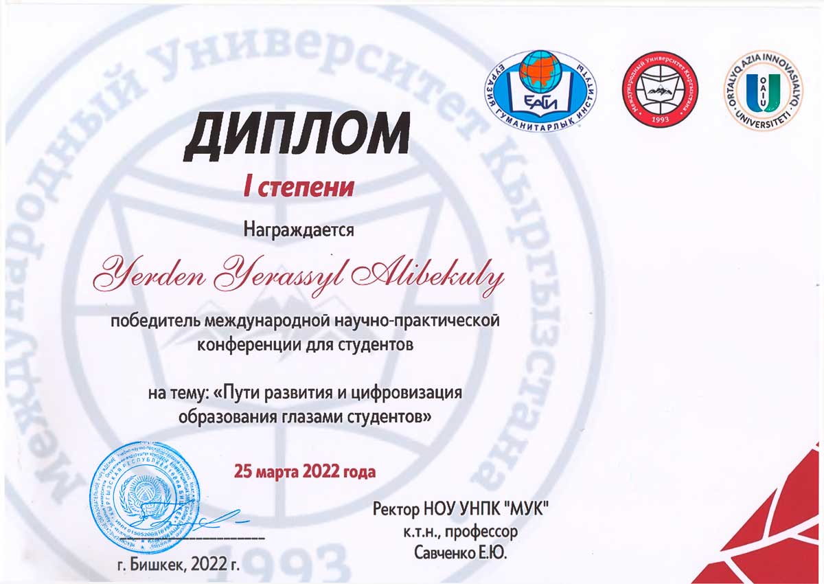 Дипломом I степени награжден Ерасыл Ерден за доклад на тему: «Concepts of teaching communicative reading» (научный руководитель: м.п.н., доцент Алипбекова Л.У.).