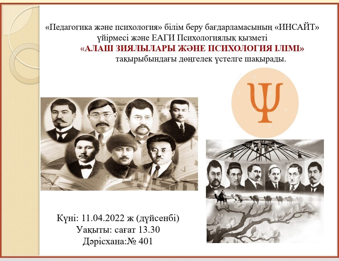 На кафедре педагогики прошли ряд мероприятий, приуроченных к празднованию Дня науки. Так, 11 апреля 2022 года студенты образовательной программы «Педагогика и психология» – члены кружка «Инсайт» и сотрудники Психологической службы ЕАГИ организовали и провели круглый стол на тему: «Интеллигенция Алаша и учение о психологии». Гостями круглого стола стали преподаватели кафедры: Аязбаева А.Т., Тобагабылова И.А., Турманова Ж.Е., Муликова А.С. и др. Состоялся живой обмен мнениями по вопросам повестки заседания.