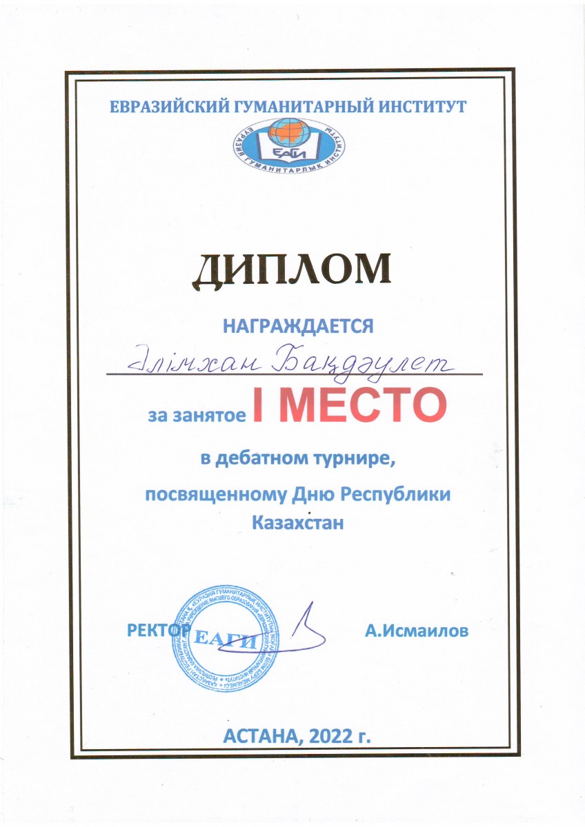 1 место – Әлімхан Бақдәулет, студент образовательной программы «Юриспруденция» (академическая группа ЮР-20-01);