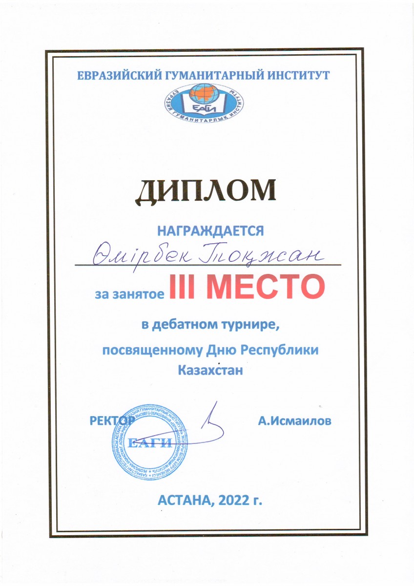 3 место – Өмірбек Тоқжан, студент образовательной программы «Шетел тілі: екі шетел тілі» (академическая группа ШТ-22-02).