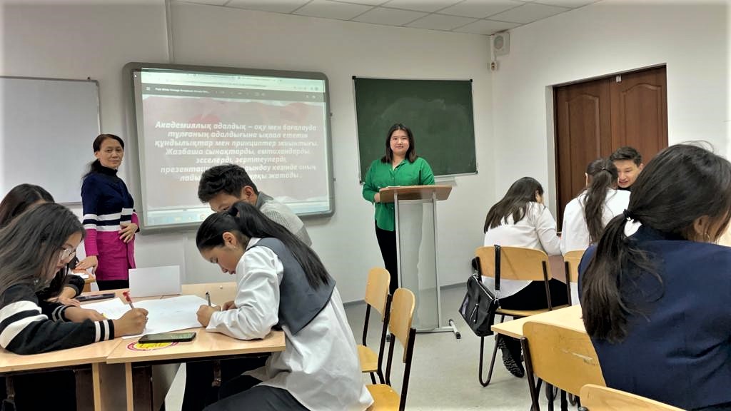 24 ноября 2022 года старший преподаватель кафедры казахской и русской фиологии Евразийского гуманитарного института, м.ф.н. Нурбанова А.К. провела кураторский час со студентами группы ҚТ-22-01 образовательной программы «Казахский язык и литература» на тему «Академическая честность». Целью кураторского часа было формирование у молодежи таких ценностей, как нетерпимость к коррупции, честность, справедливость, добропорядочность и патриотизм.