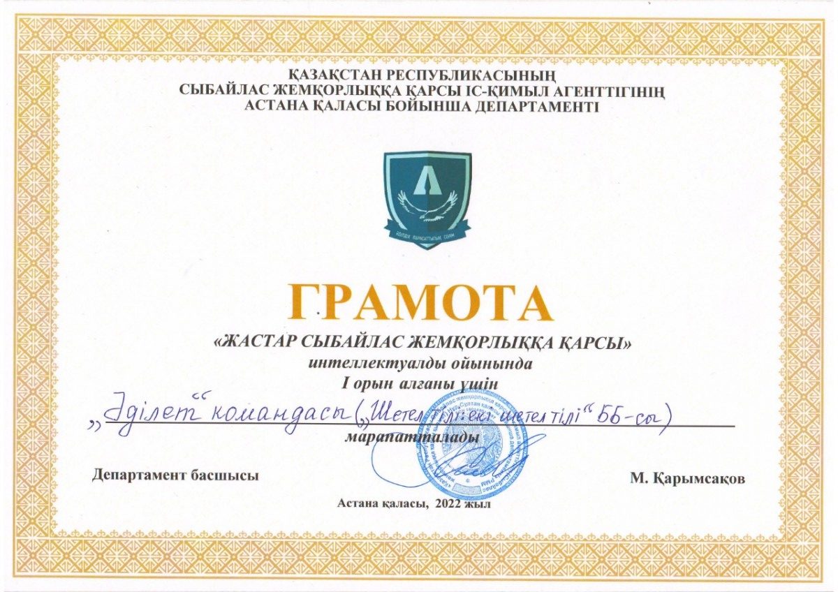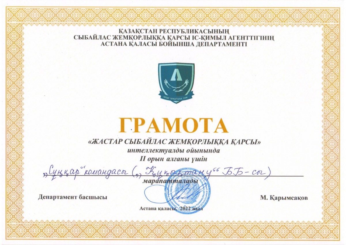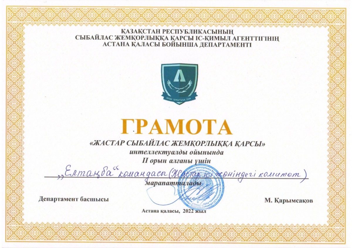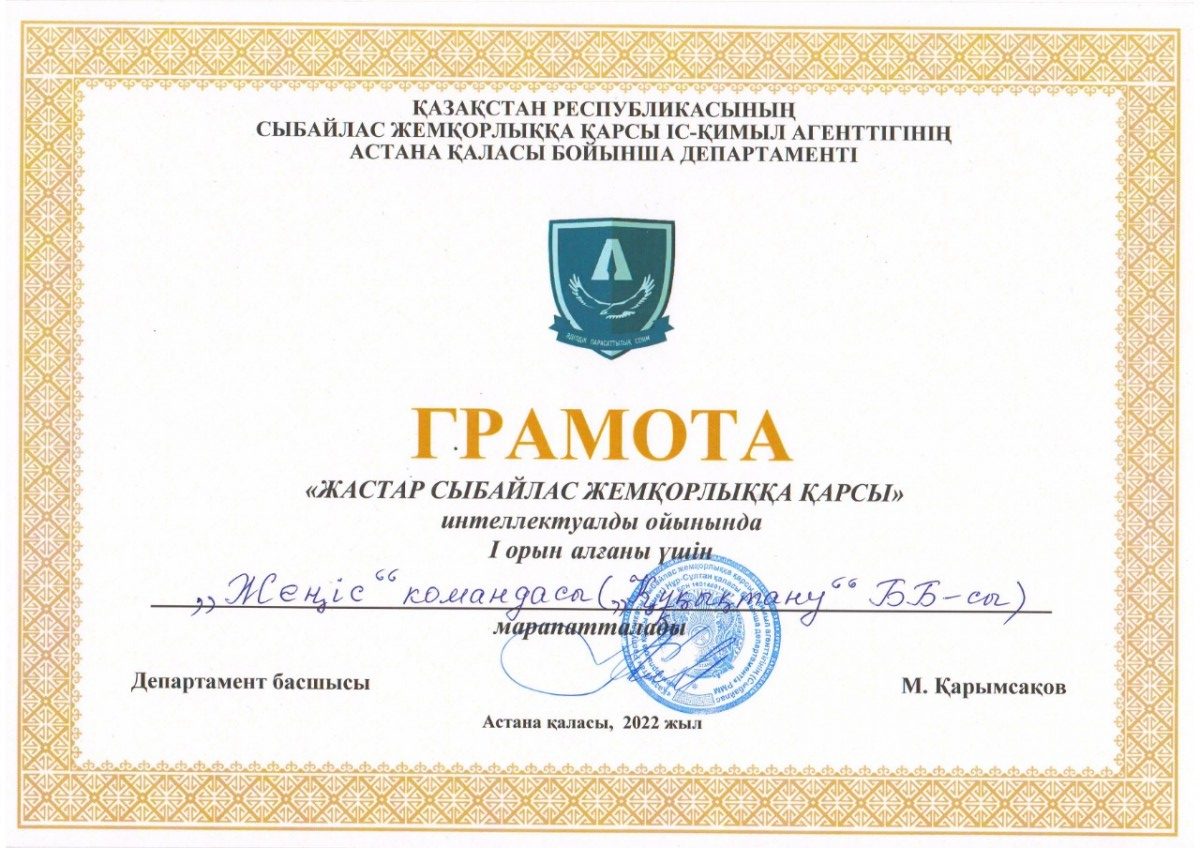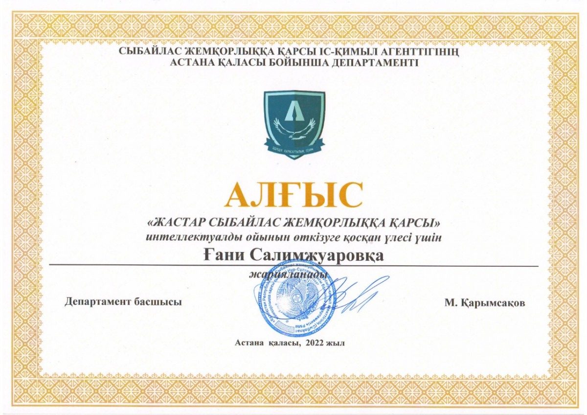 Всем победителям и призерам, а также организаторам интеллектуальной игры – председателю КДМ, Президенту Студенческого Парламента Абильдиной Айгерим (академическая группа ЮК-19-01) и председателю студенческого антикоррупционного клуба «Саналы Ұрпақ» Салимжуарову Гани (академическая группа ЮР-20-01) были вручены грамоты, благодарственные письма Департамента Агентства Республики Казахстан по противодействию коррупции по г.Астане и призы Управления по противодействию наркопреступности Департамента полиции г. Астаны.