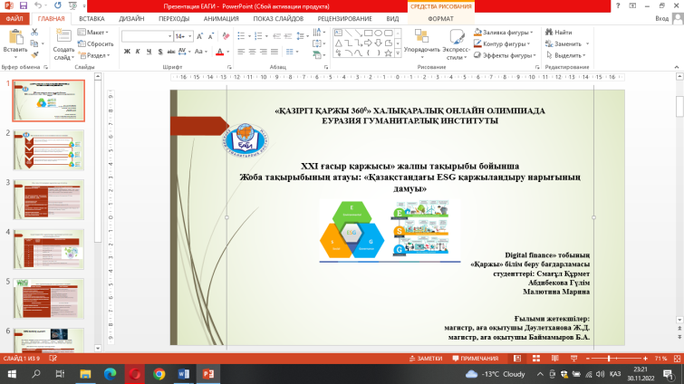 По результатам двух туров олимпиады команда Евразийского гуманитарного института «Digital finance» (в ее состав вошли студенты 3 – 4 курсов образовательной программы «Финансы» Смағұл Қ., Абдибекова Г., Малютина М.) награждена дипломом в номинации «Уникальный проект». Руководители проекта:  магистры, старшие преподаватели  Дәулетханова Ж.Д., Баймамыров Б.А.