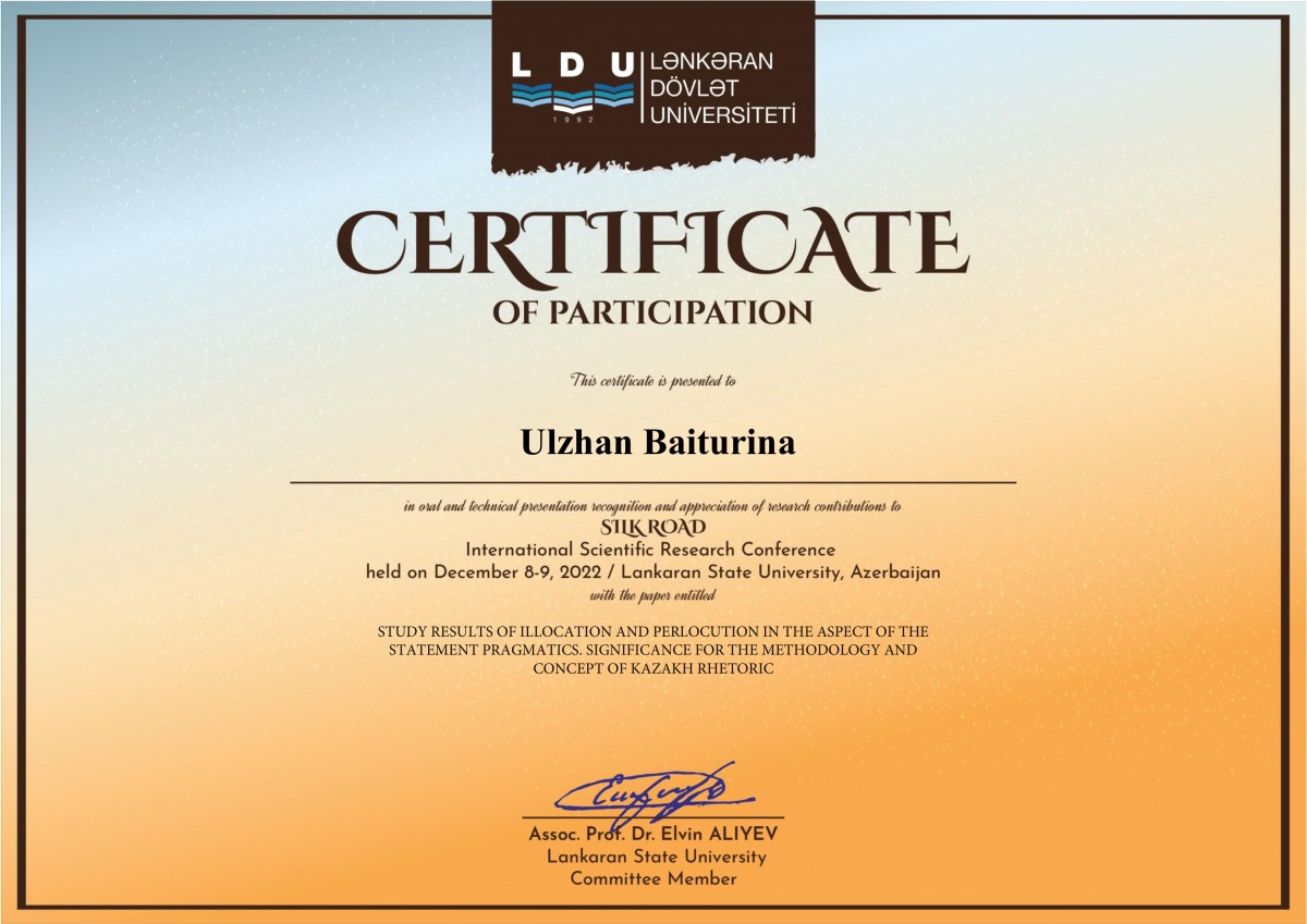 В рамках проекта по линии Министерства науки и высшего образования РК на тему: «Научная концепция казахской риторики: риторический идеал, идентичность, аргументация и речевая практика» руководитель проекта – профессор ЕНУ имени Л.Н.Гумилева К.Уразаева и доцент кафедры иностранных языков ЕАГИ У. Байтурина приняли участие в работе международного научного конгресса «Шелковый путь» при Ленкоранском государственном университете (Азербайджан) с докладами по проблемам казахской риторики.