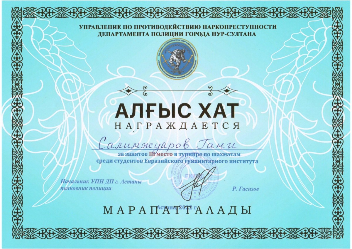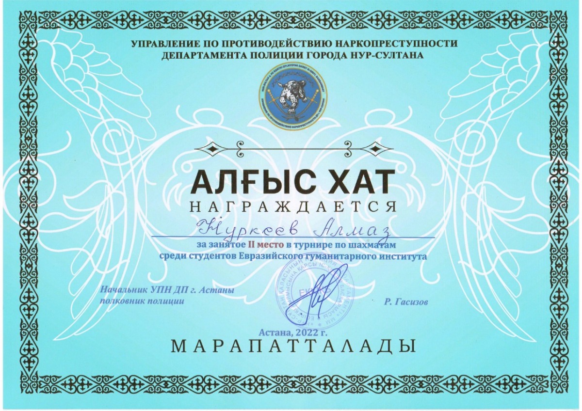 Победители и участники турнира были награждены грамотами ЕАГИ и ценными призами Управления по противодействию наркопреступности Департамента полиции г. Астаны.