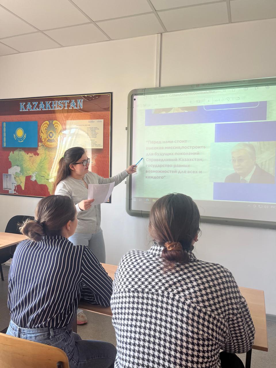 16 сентября 2024 года в академической группе ИЯТ-24-01 (1 курс, образовательная программа «Иностранный язык: два иностранных языка») прошел кураторский час под руководством куратора Марденовой Н.А. по обсуждению Послания Президента РК К.-Ж. К. Токаева  народу Казахстана.  Студенты группы  Капизова С.  и Тлеуканова К.  представили презентацию на обсуждаемую тему.