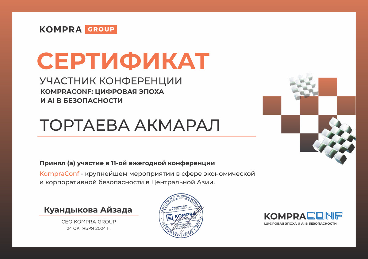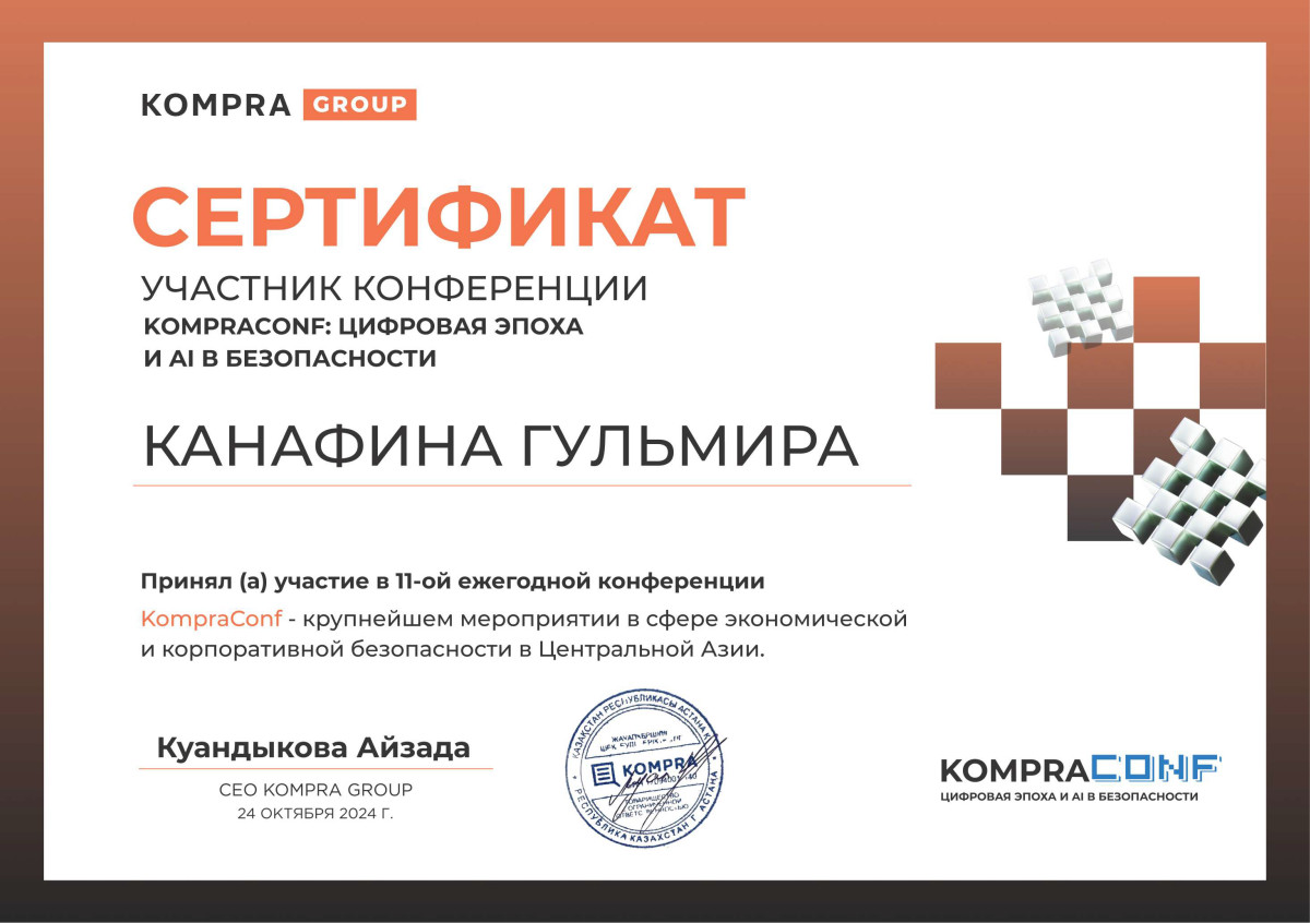 24 октября 2024 года преподаватели кафедры юридических дисциплин Балжанова А.К., Канафина Г.А., Тортаева А.Э., приняли участие в 11-ой ежегодной конференции KompraConf «Цифровая эпоха и AI в безопасности», которая была организована Международным Финансовым Центром г.Астана. По завершению конференции все участники получили сертификаты.