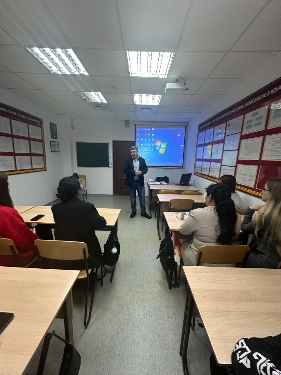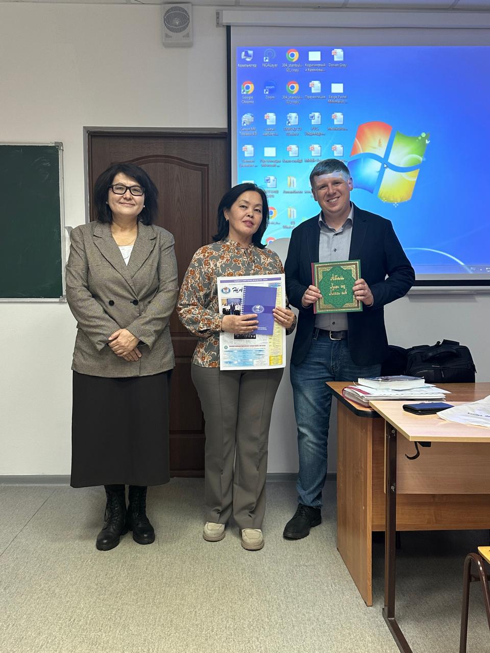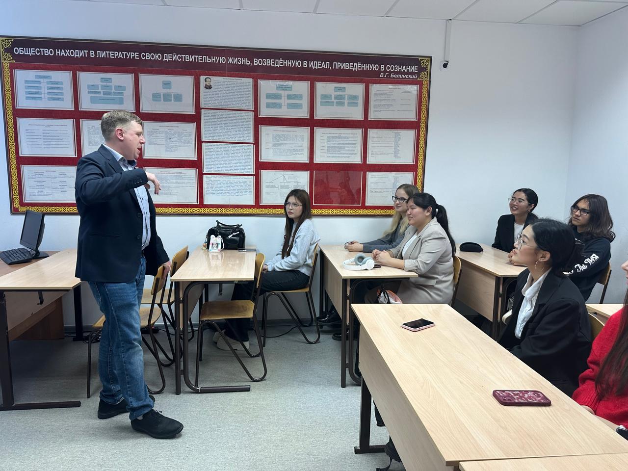 30 октября 2024 года на кафедре иностранных языков и переводческого дела прошла встреча студентов 2 – 3 курсов образовательной программы «Иностранный язык: два иностранных языка» (академические группы ИЯ-23-01, ШТ-22-02, ИЯ-22-01) с преподавателем английского языка, партнером американских программ «English for journalist » и «English for STEM», ведущим программы «Hello Kazakhstan» на канале Jibek Joly TV Nicholas Drapeau. Встреча вызвала теплый отклик у студентов, которые активно вовлеклись в диалог, задавая интересующие их вопросы.