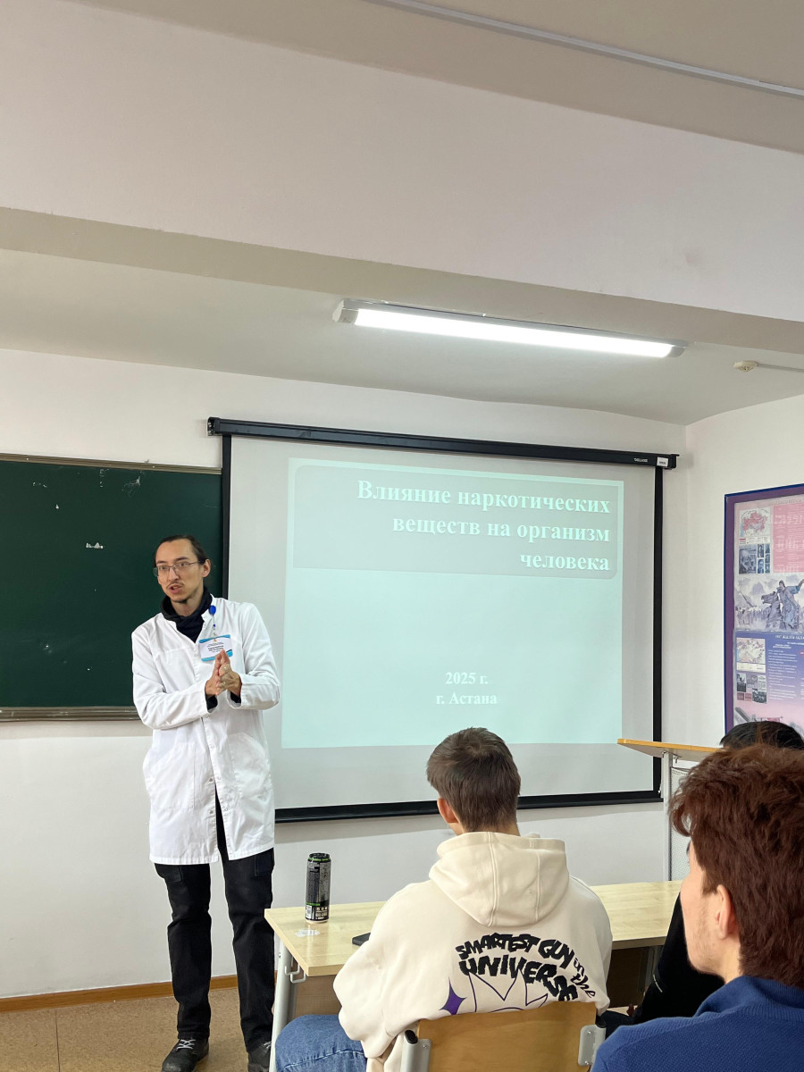 13 февраля 2025 года прошла встреча студентов кафедры педагогики и истории с врачом центра ЗОЖ отделения профилактики и социально-психологической помощи ГКП на ПХВ Городской поликлиники №3 г.Астана А. Нурмагамбетовым. Тема встречи: «Влияние наркотических веществ на организм человека». По окончанию встречи состоялась увлекательная дискуссия, в ходе которой студенты получили ответы на все интересующие их вопросы.
