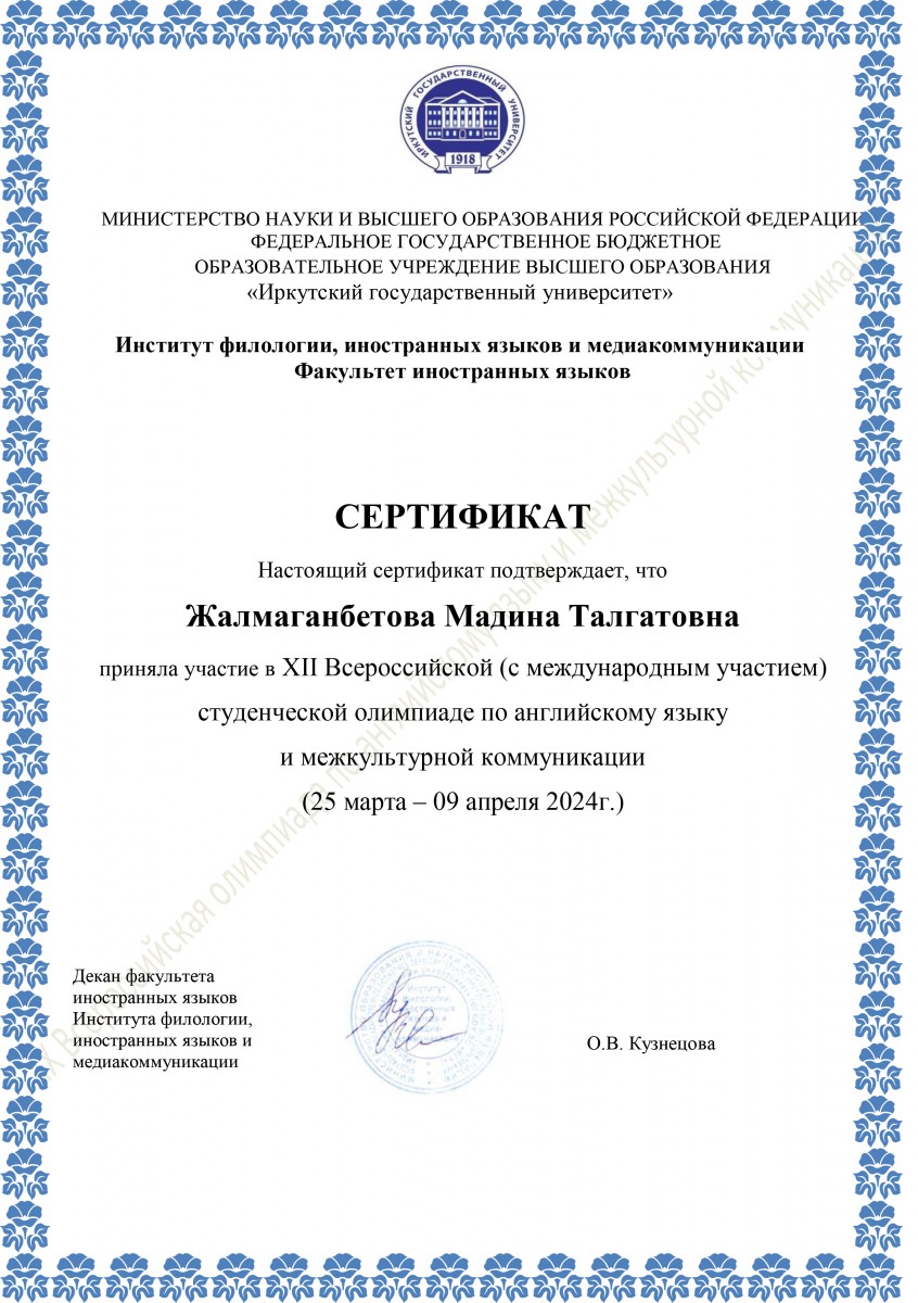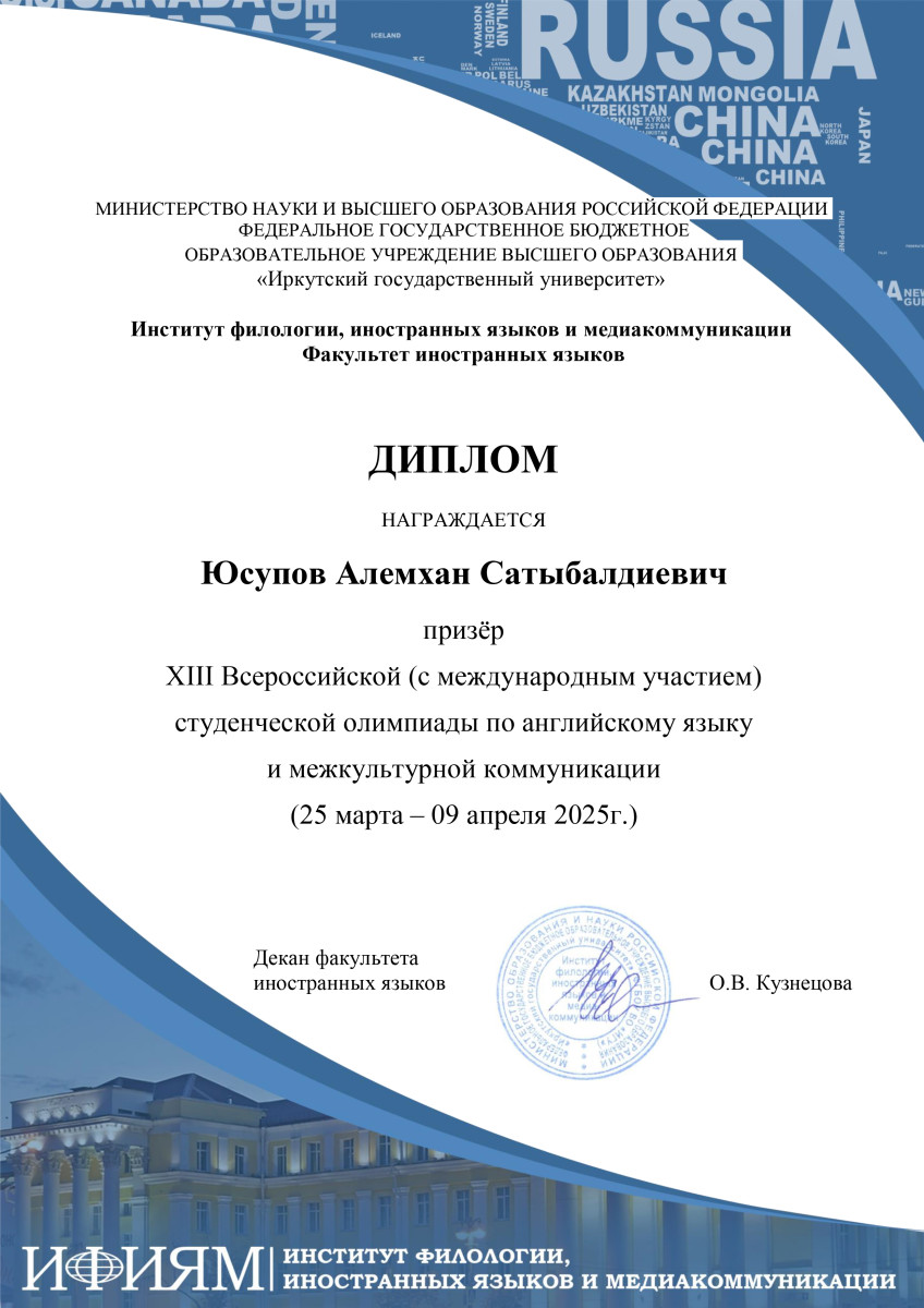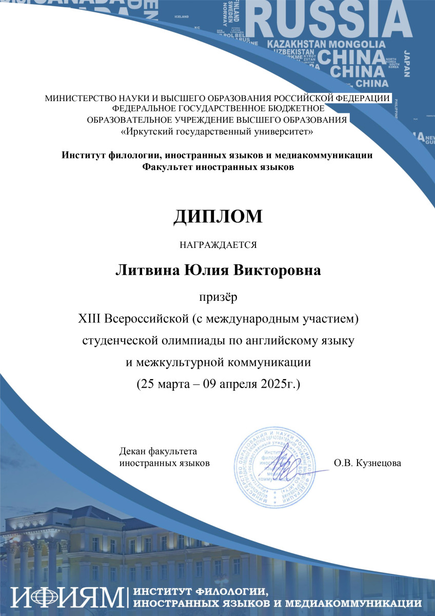 Кафедра английской филологии Института филологии, иностранных языков и медиакоммуникации ФГБОУ ВО «Иркутский государственный университет» в период с 25 марта по 9 апреля 2025 года проводила XII Всероссийскую (с международным участием) студенческую олимпиаду по английскому языку и межкультурной коммуникации. Для участия были приглашены студенты высших учебных заведений, обучающиеся по направлениям подготовки «Лингвистика» и «Филология», уровень владения английским языком: профессиональный (уровень С1 согласно Европейской классификации). Олимпиада проводилась в заочной форме с применением дистанционных технологий, в режиме личного первенства, в два тура: отборочный и заключительный.