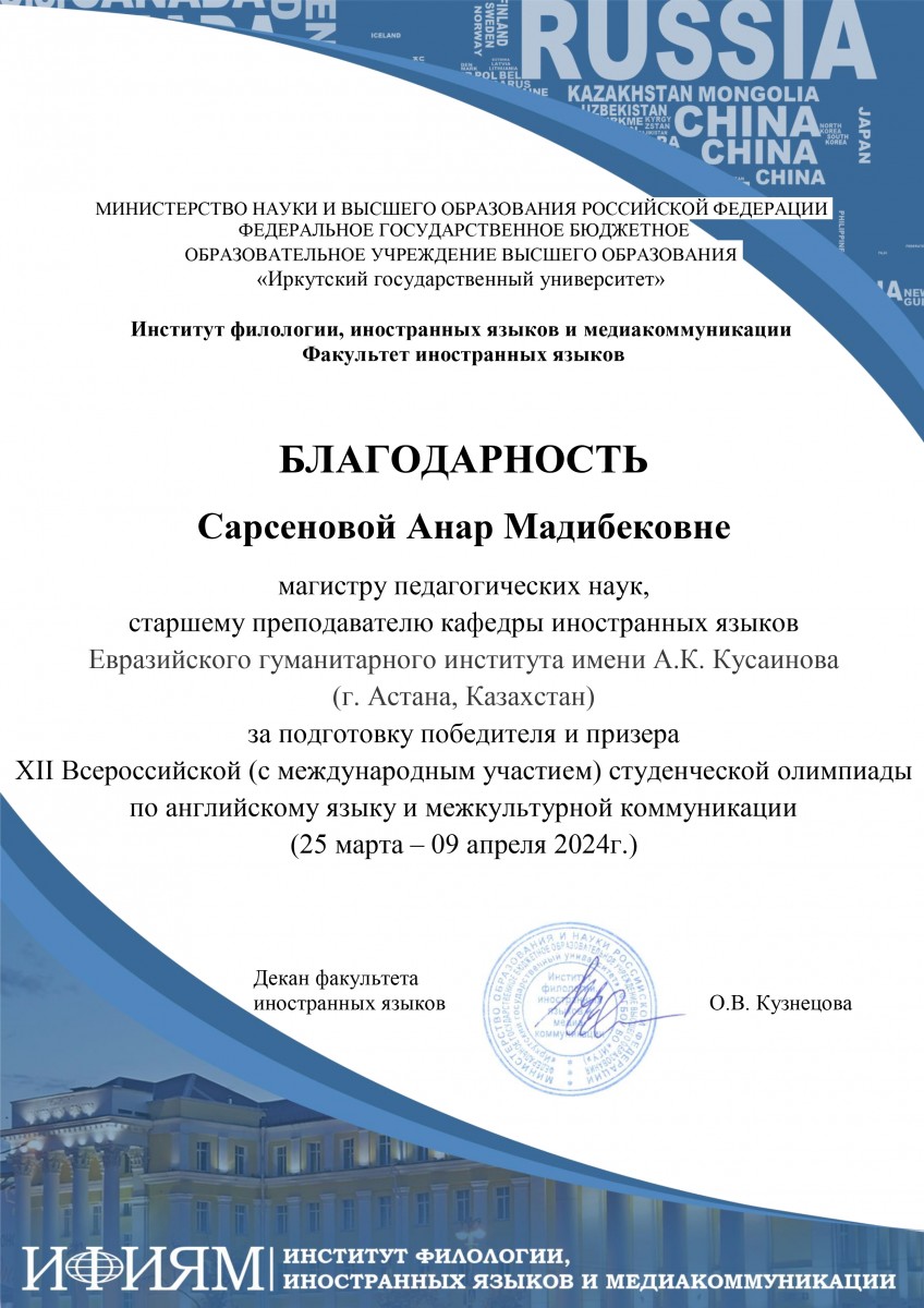 В олимпиаде приняли участие и студенты 2-3 курсов образовательной программы «Иностранный язык: два иностранных языка» Евразийского гуманитарного института имени А.К.Кусаинова. По итогам олимпиады Найденова Даяна (академическая группа ИЯ 22-01) заняла 2 место, Муканова Дильназ, Юсупов Алемхан, Литвина Юлия (академическая группа ИЯ-23-01) также стали призерами олимпиады. Научный руководитель: старший преподаватель, м.п.н Сарсенова А.М.