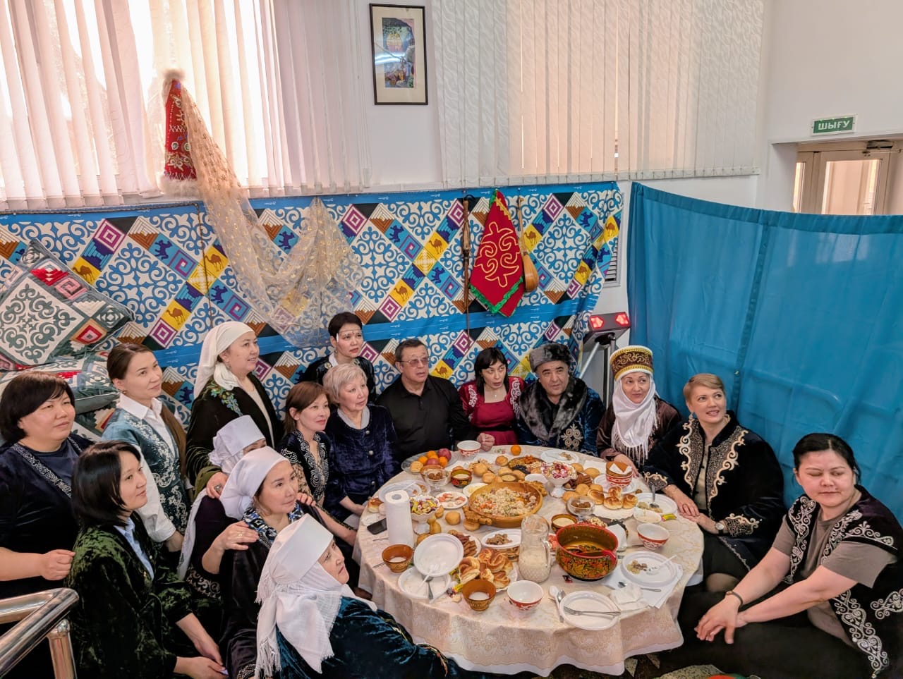 Библиотекари приняли также участие и в праздничном мероприятии института. Переодевшись в национальные костюмы, вместе с коллегами провели обряд «Бесікке салу».