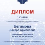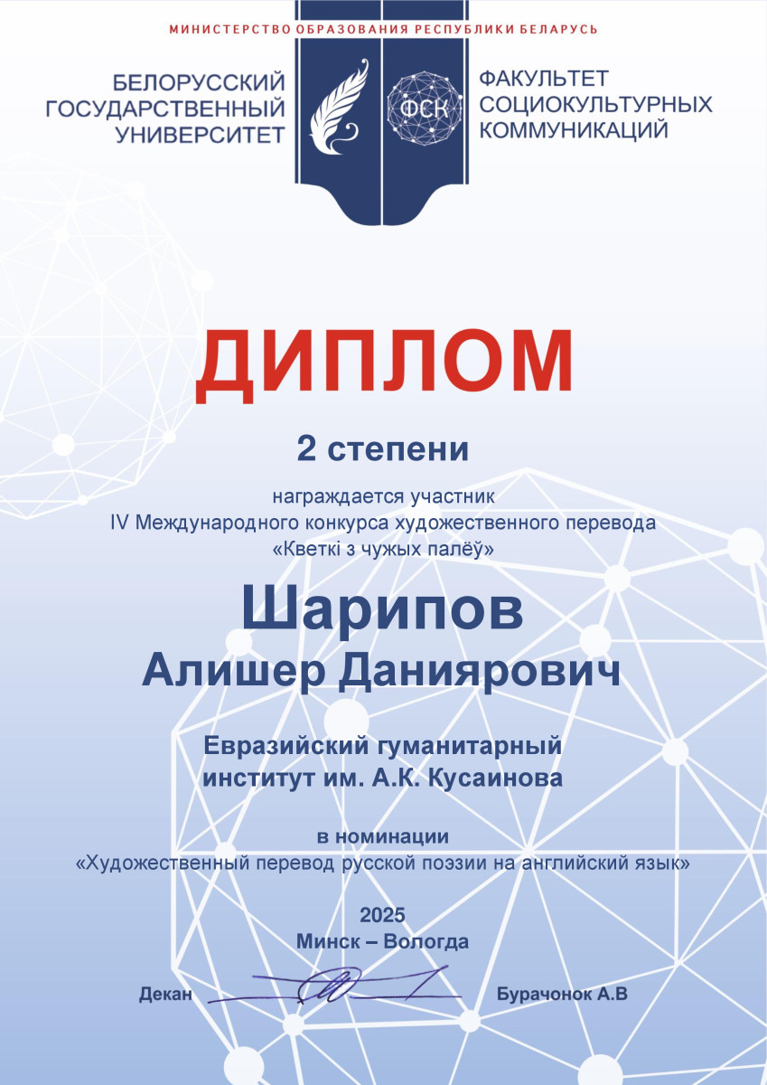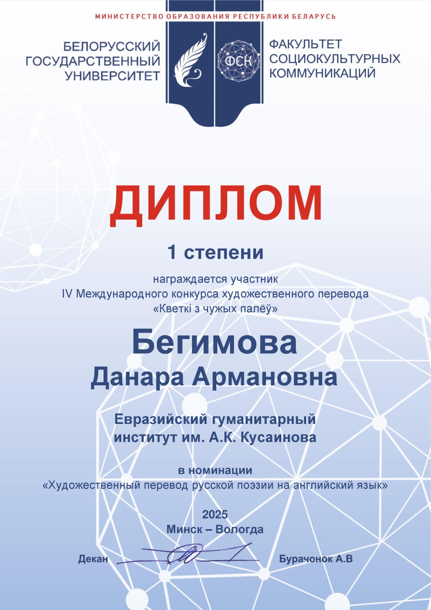 Студенты 2 курса образовательной программы «Иностранн ый язык: два иностранных языка» ( академическая  группа ИЯ- 23-01 ) Евразийского гуманитарного института имени А.К.Кусаинова Данара Бегимова и Алишер Шарипов приняли участие в IV Международном конкурсе художественного перевода «КВЕТКІ З ЧУЖЫХ ПАЛЁЎ» в номинации «Художественный перевод русской поэзии на английский язык » . О рганизаторами конкурса выступили: кафедра теории и практики перевода факультета социокультурных коммуникаций Белорусского государственного университета (Республика Беларусь) и кафедра английского языка Института социальных и гуманитарных наук Вологодского государственного университета (Россия) . Цель данного мероприятия: развитие творческой инициативы и выявление талантливой молодежи, желающей осуществлять профессиональную переводческую деятельность. По итогам конкурса Бегимова Д. стала победителем, Шарипов А. занял второе место. Научный руководитель студентов : старший преподаватель кафедры иностранных языков и переводческого дела Сарсенова А.М .