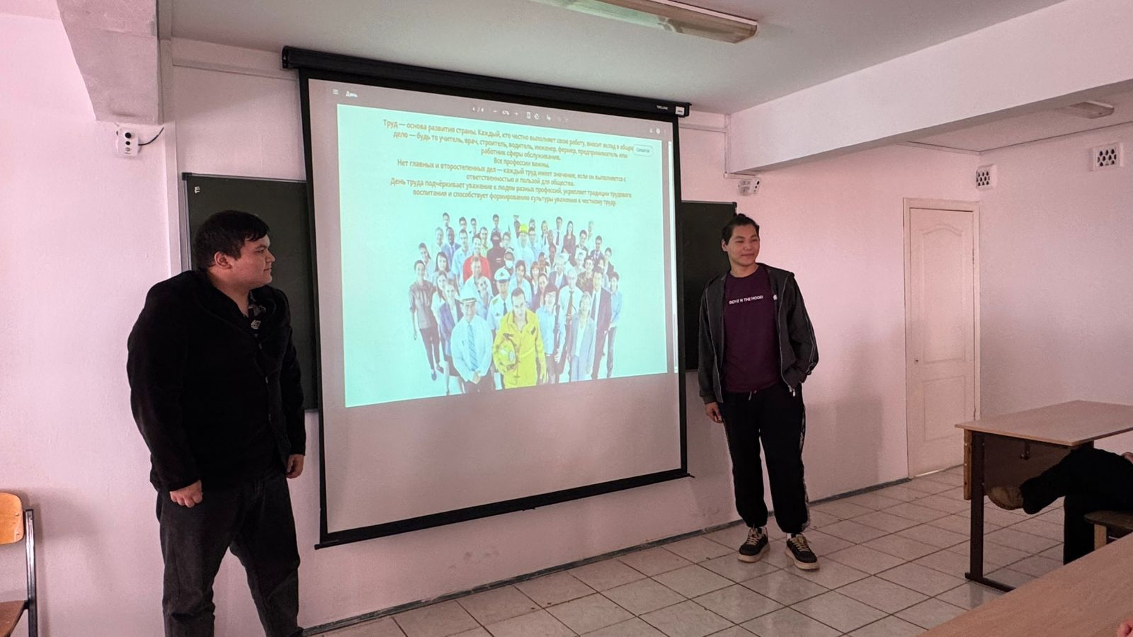 9 октября 2025 года куратор Балжанова А. К.  провела кураторский час на тему: «День труда» для студентов 1 – 2 курсов образовательной программы «Юриспруденция» (академические группы ЮР-25-01,  ЮР-24-01). На кураторском часе говорилось о важности труда в жизни каждого человека, о необходимости воспитания уважения к рабочим профессиям, а также о вкладе каждого работающего специалиста в развитие и процветание нашего общества.