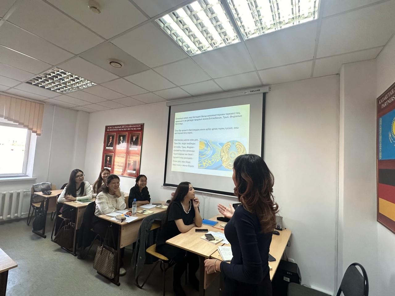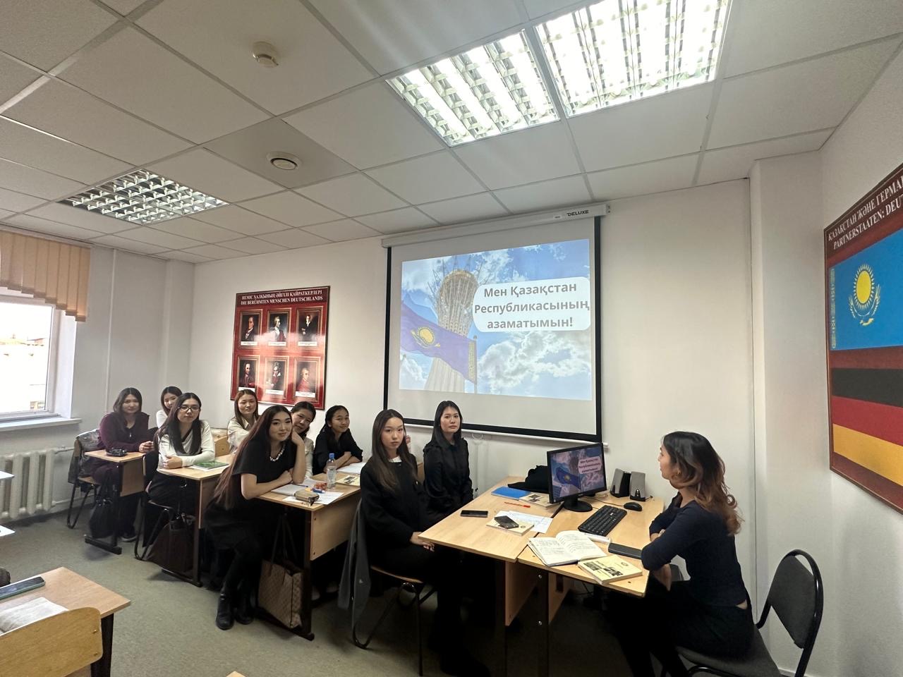21 октября 2025 года в преддверии Дня Республики Казахстан куратор Сарсенова А.М. для студентов академической группы ШТ-23-03 (3 курс, образовательная программа «Иностранный язык: два иностранных языка») провела кураторский час “Я – гражданин Республики Казахстан”. Студенты познакомились с историей праздника, с основными этапами становления и развития независимого Казахстана.